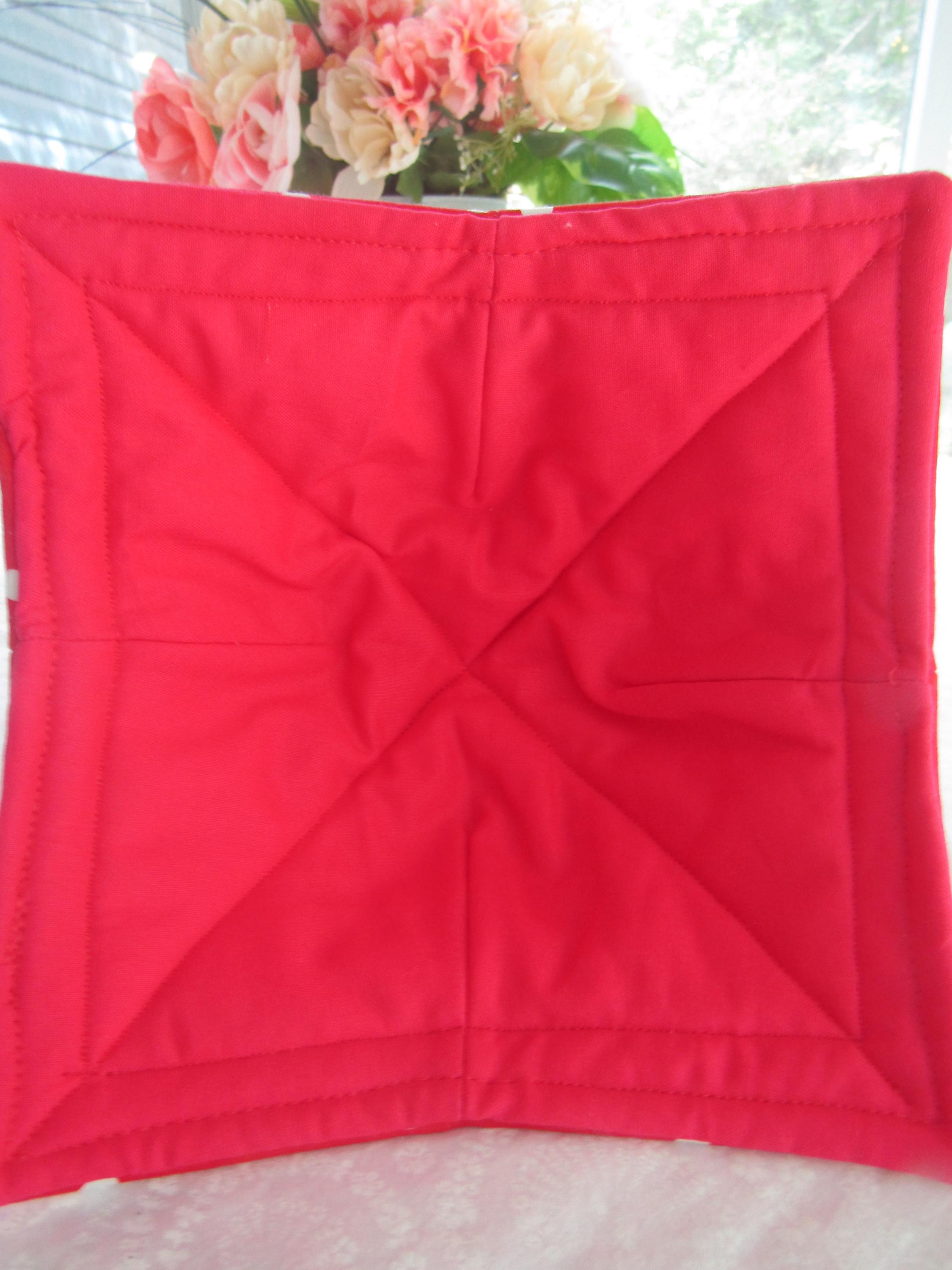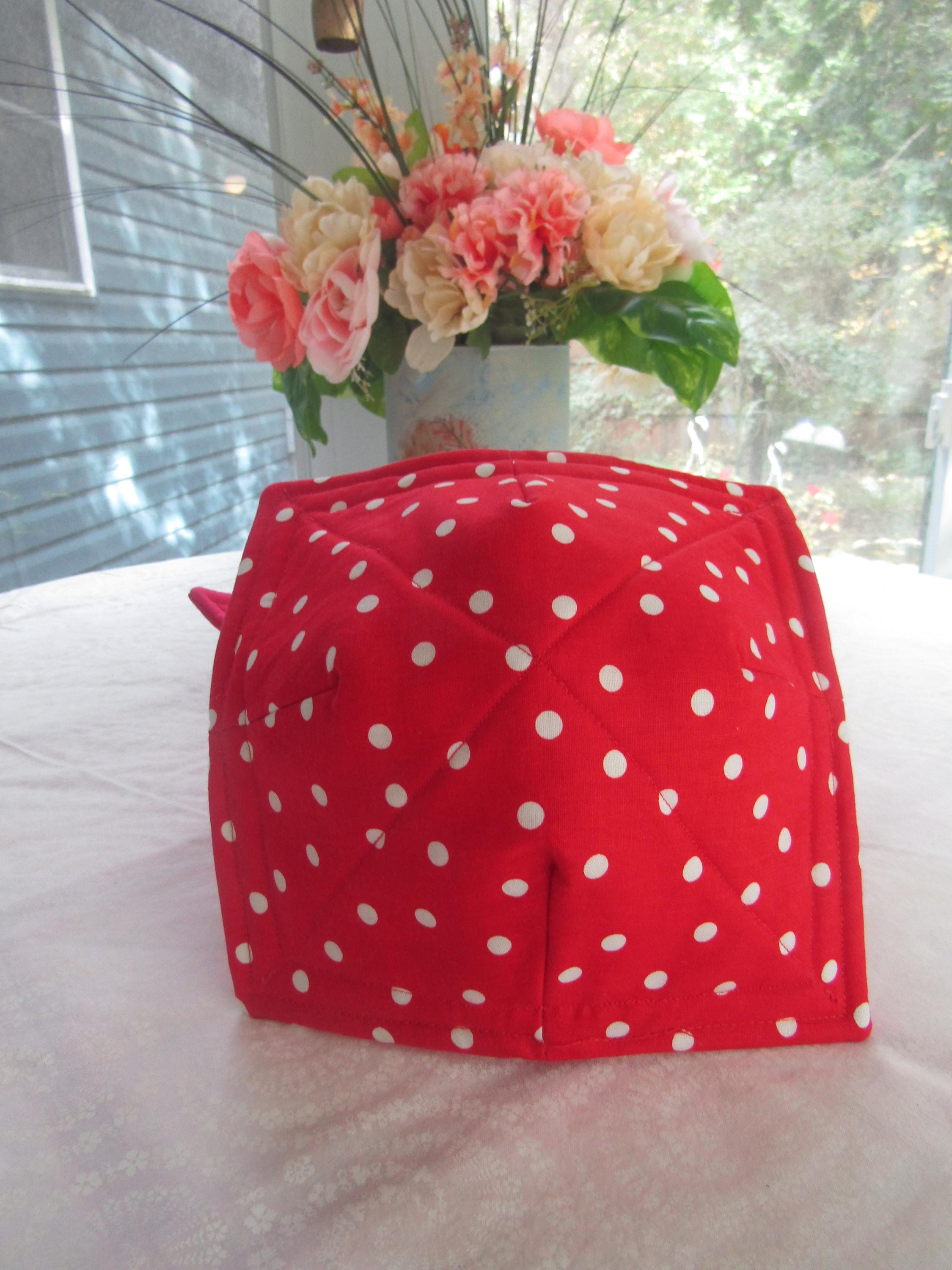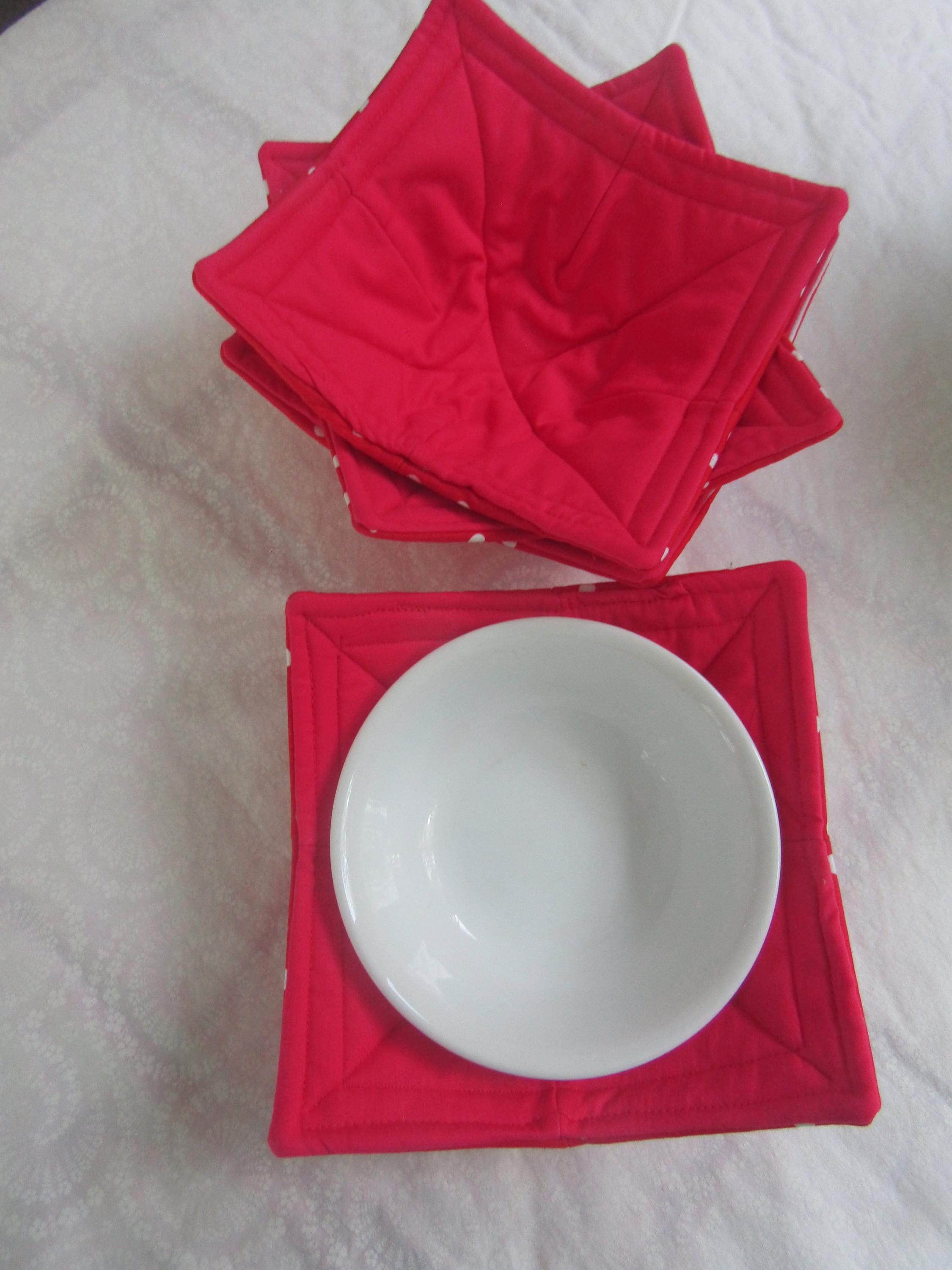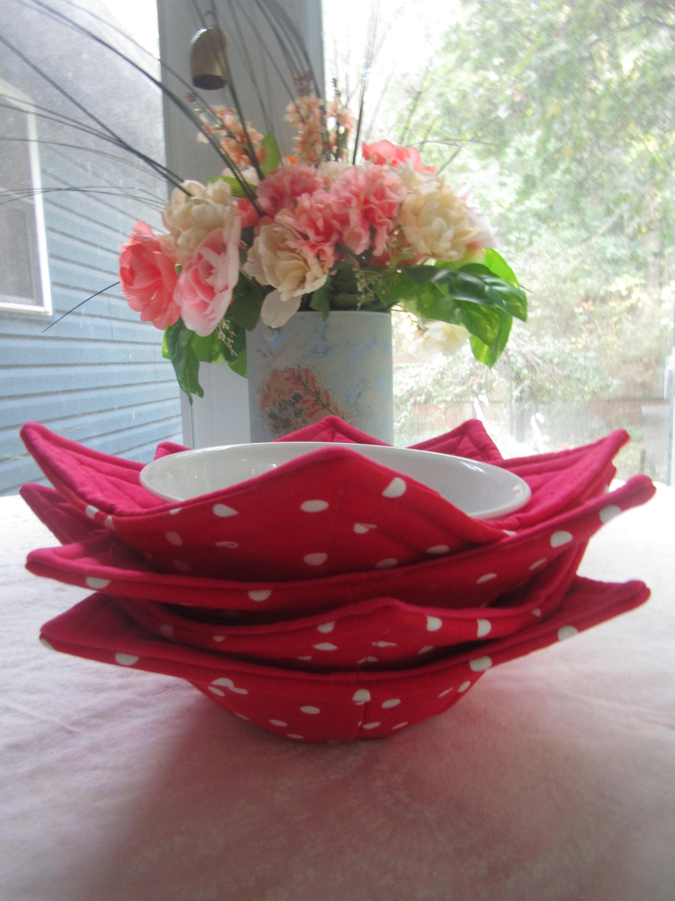 Handmade, hot, soup bowl cozies, red, white, Poka-dot, all 100%, cotton, all cotton, is what makes it microwaveable, (never leave microwave unattended or leave food in for more than four (4) min.) Never use a towel or, burn, your hands again. This is a, great, gift, for, Christmas, Wedding Showers, Teachers, Grandparents, Mother's Day, set of 4,  7" top 5" bottom.