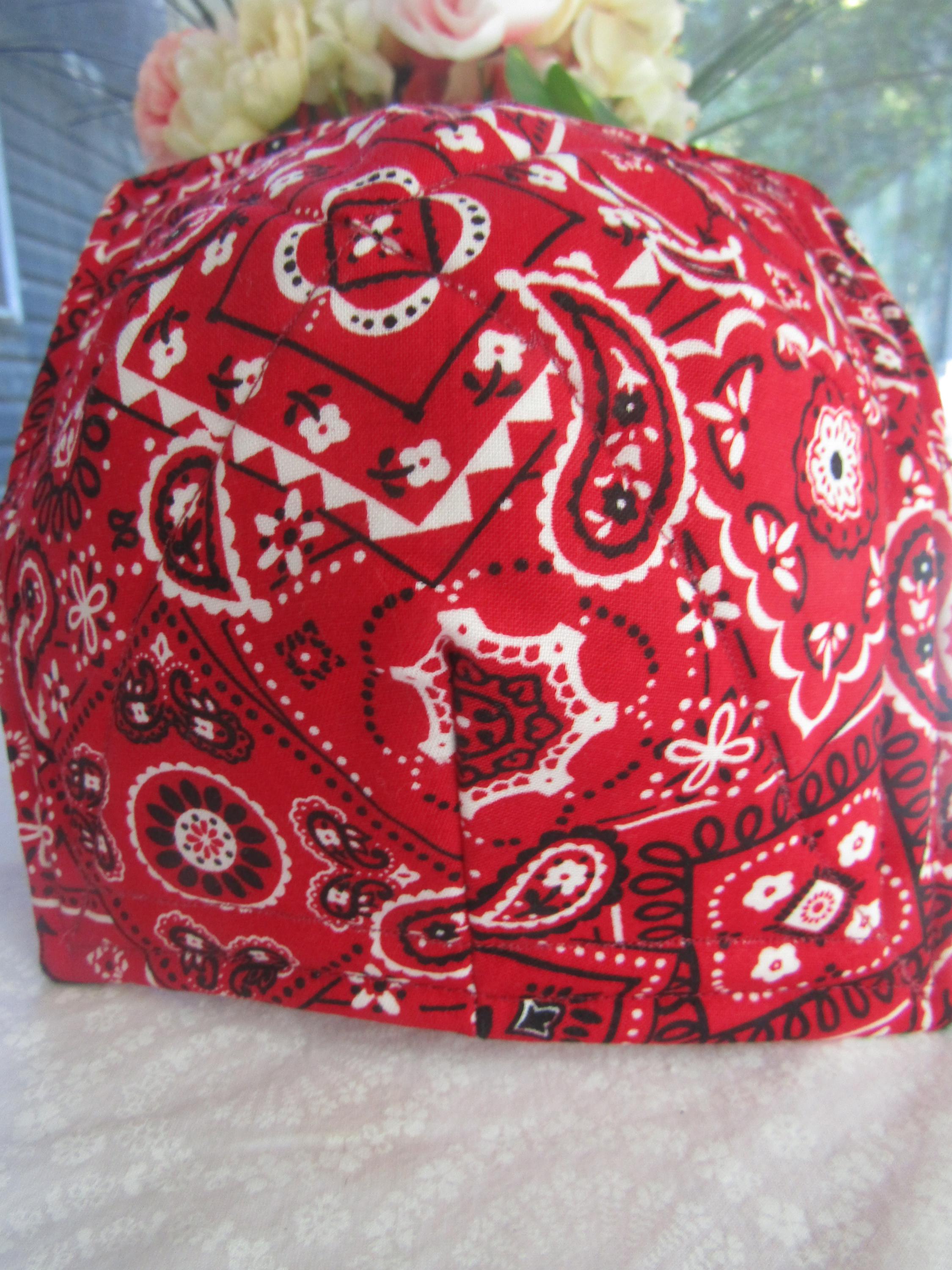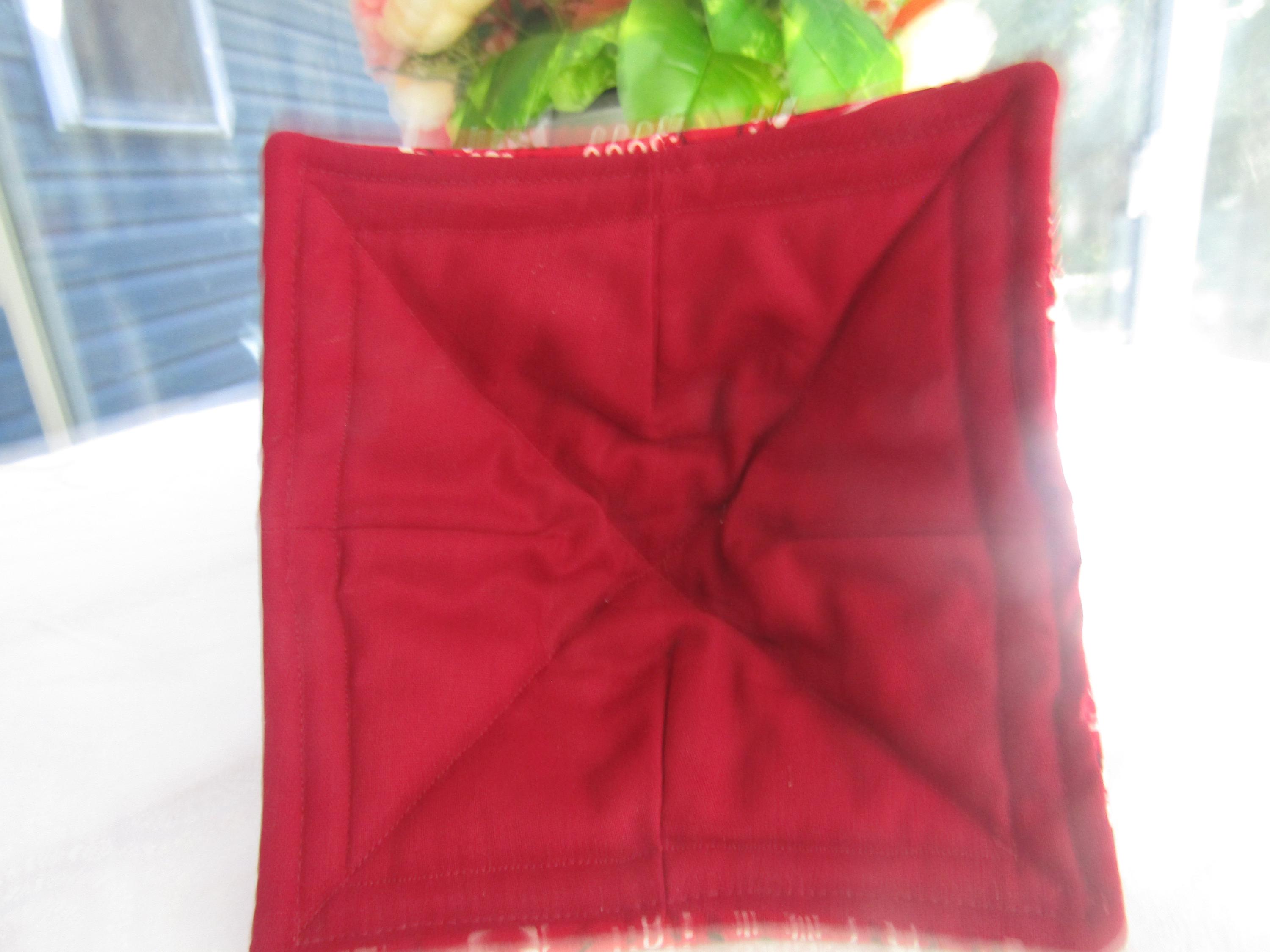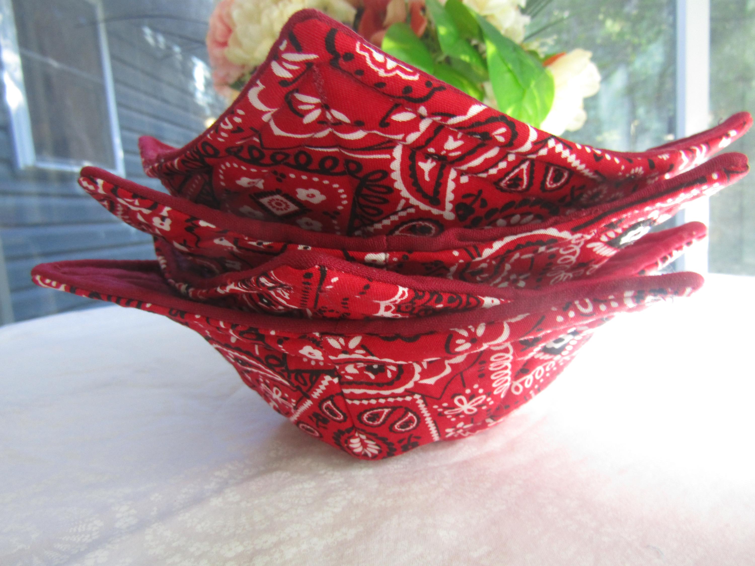 Handmade, hot, soup bowl, cozy, or, ice cream, red, paisley, design, all 100%, cotton, microwaveable, (never leave microwave unattended or leave food in more than four (4) min.) Never use a towel or burn your hands again. This is a great, gift, for, retirement, housewarming, Christmas, Wedding Showers, Mother's Day, set of 4 7" top 5" bottom