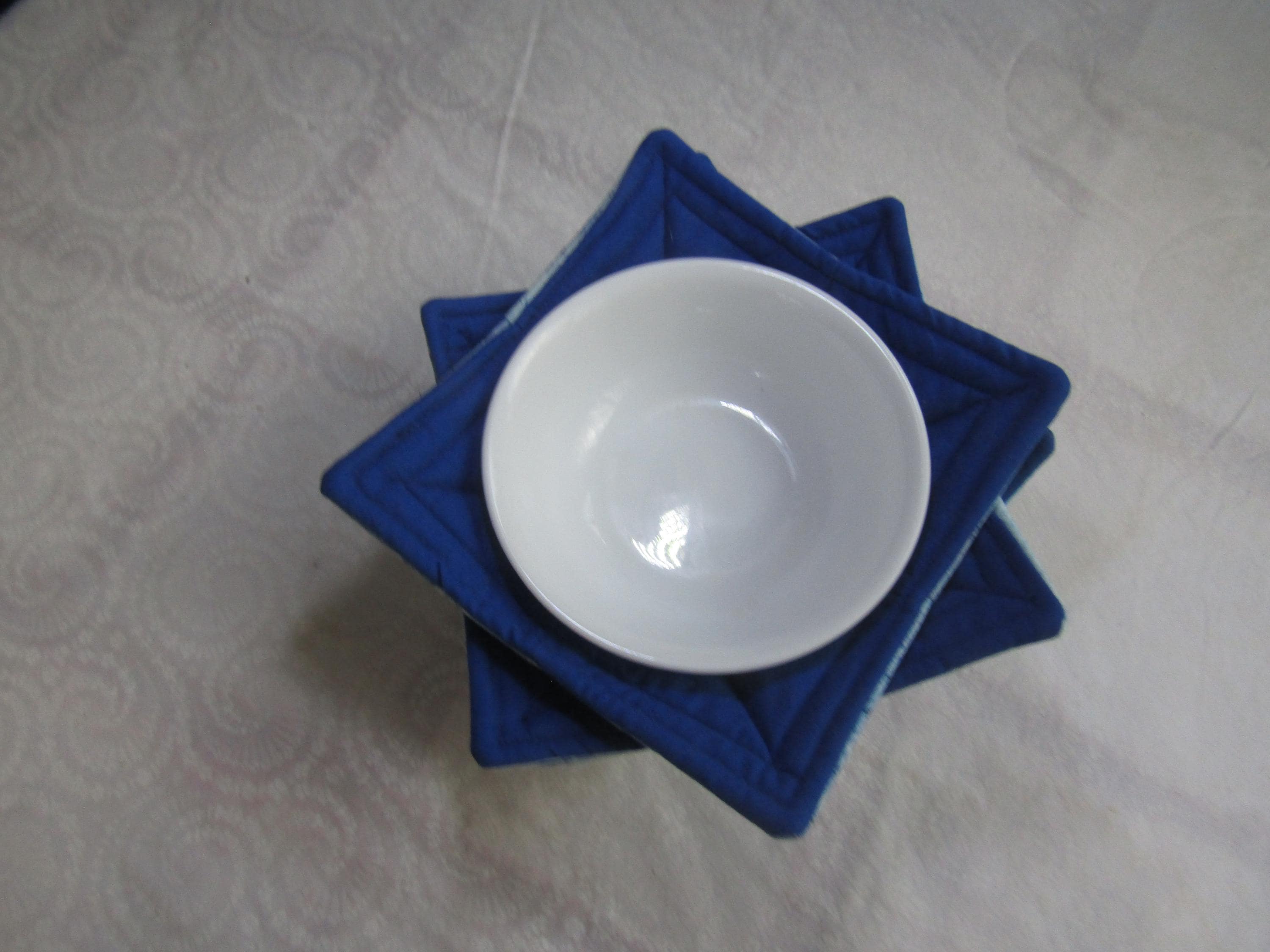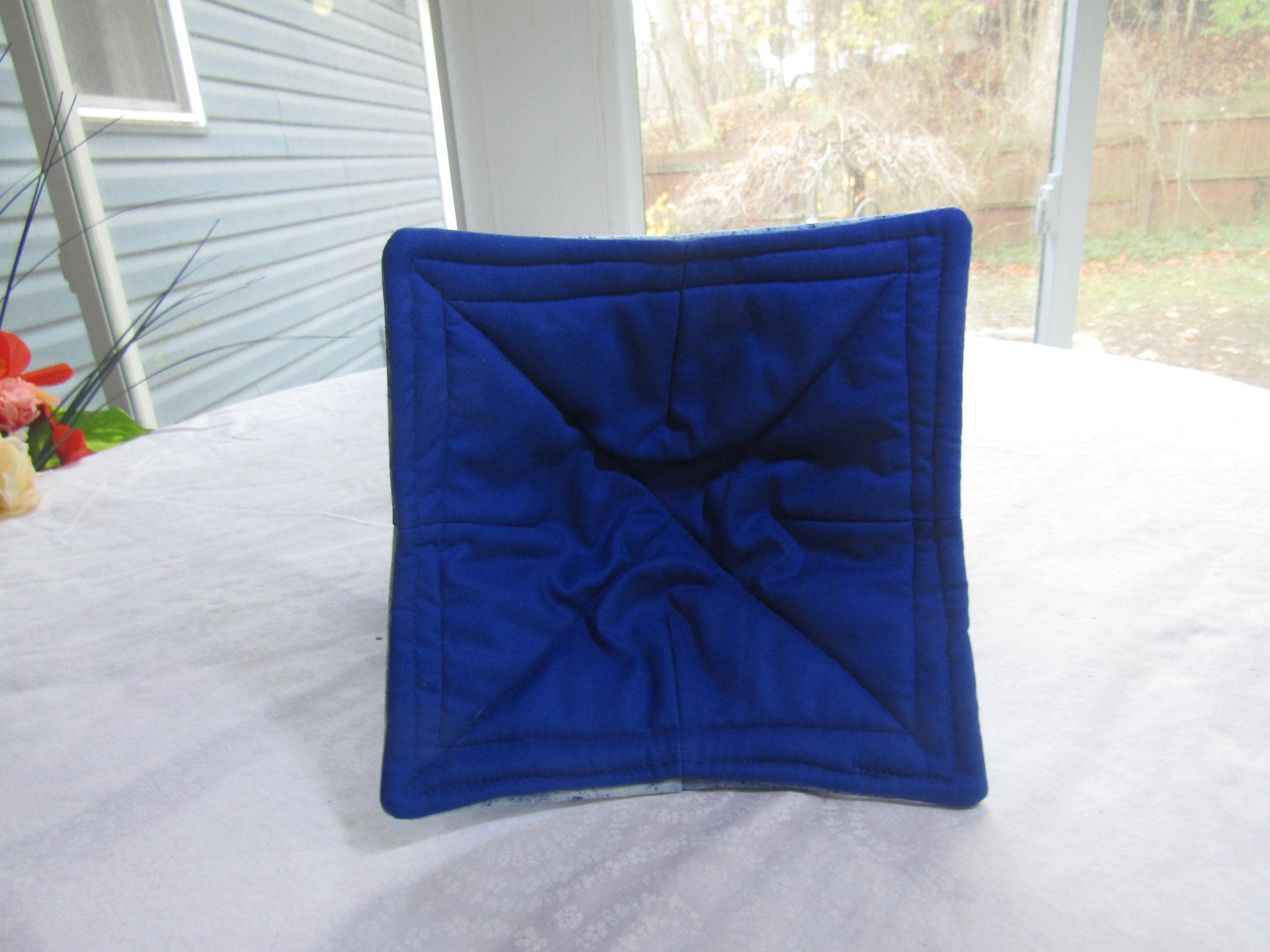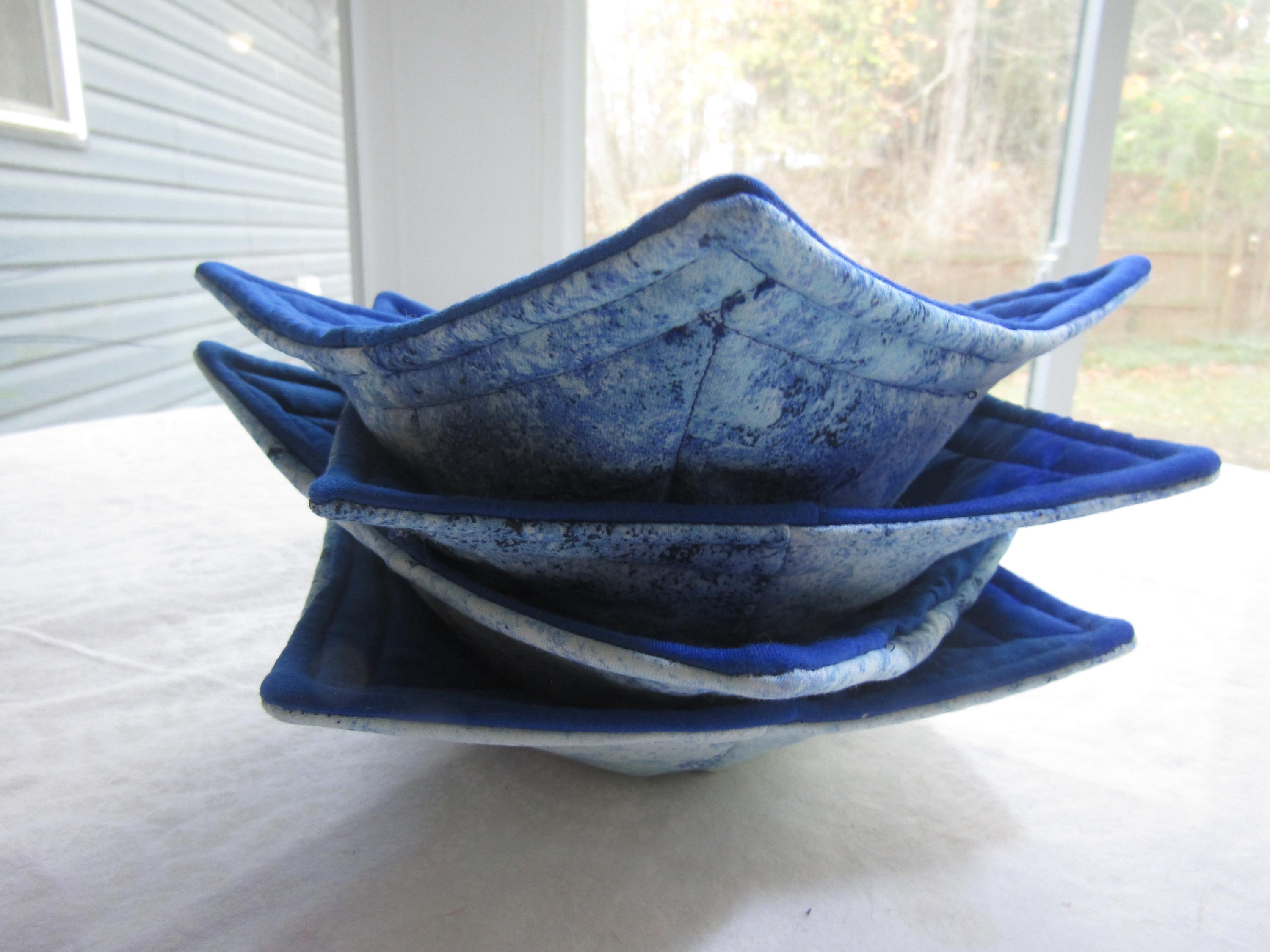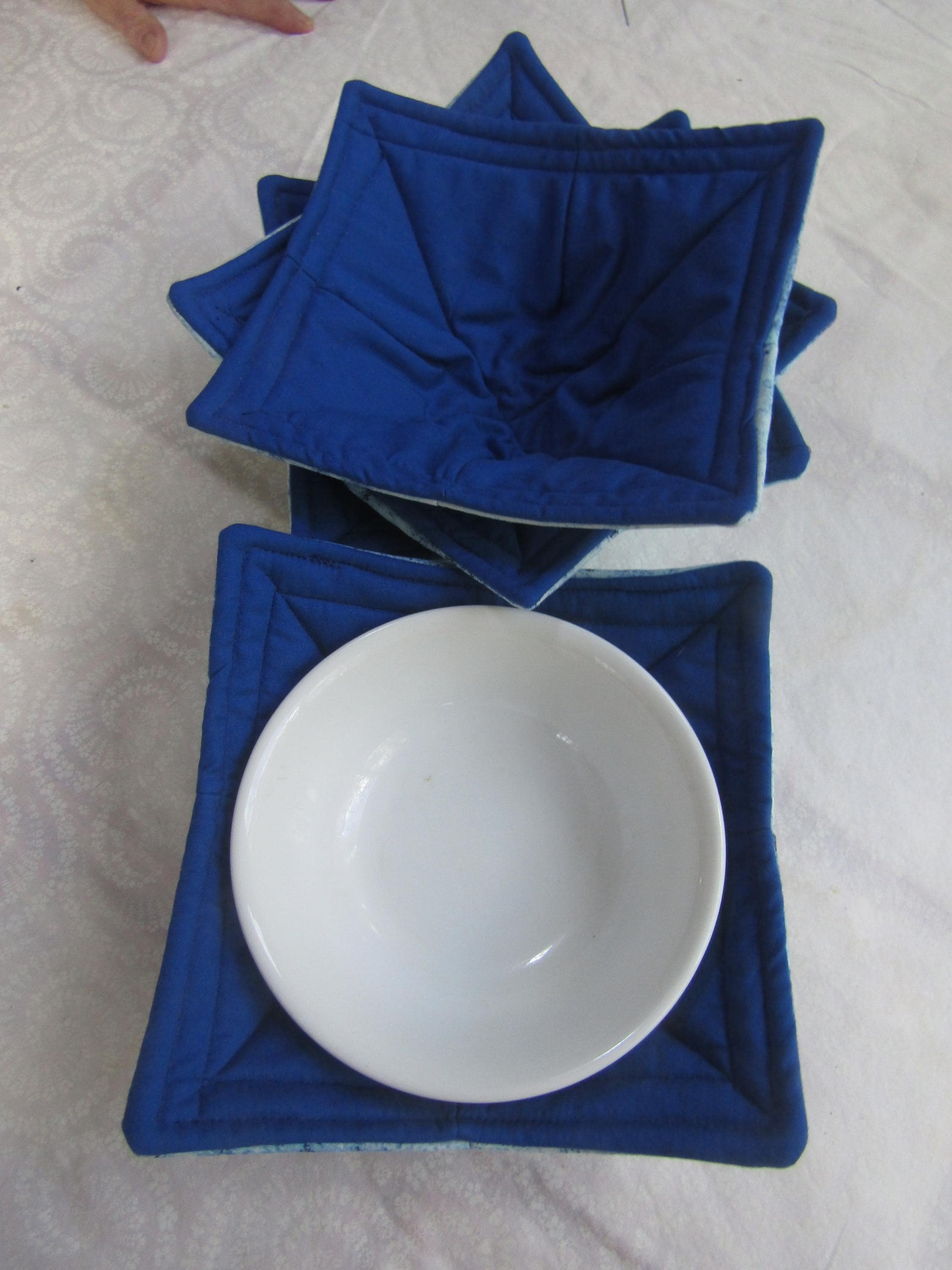 Handmade, hot, soup bowl, cozies, potholder, white, blue, red, fowers, you can even use them for, ice cream, Great, gift, for, seniors, Place bowl of soup in, cozy, and place in microwave, never, burn, your hands again, all 100%, cotton, material this is what makes it microwaveable. (Never leave microwave unattended and never leave food in more than four (4) min. ) This is a great gift for, Seniors, Christmas, bridal showers, retirement, Mother's Day, (Please DO NOT heat dry food in the cozy, there must be moisture in the bowl.) size medium to large soup bowl. set of 4