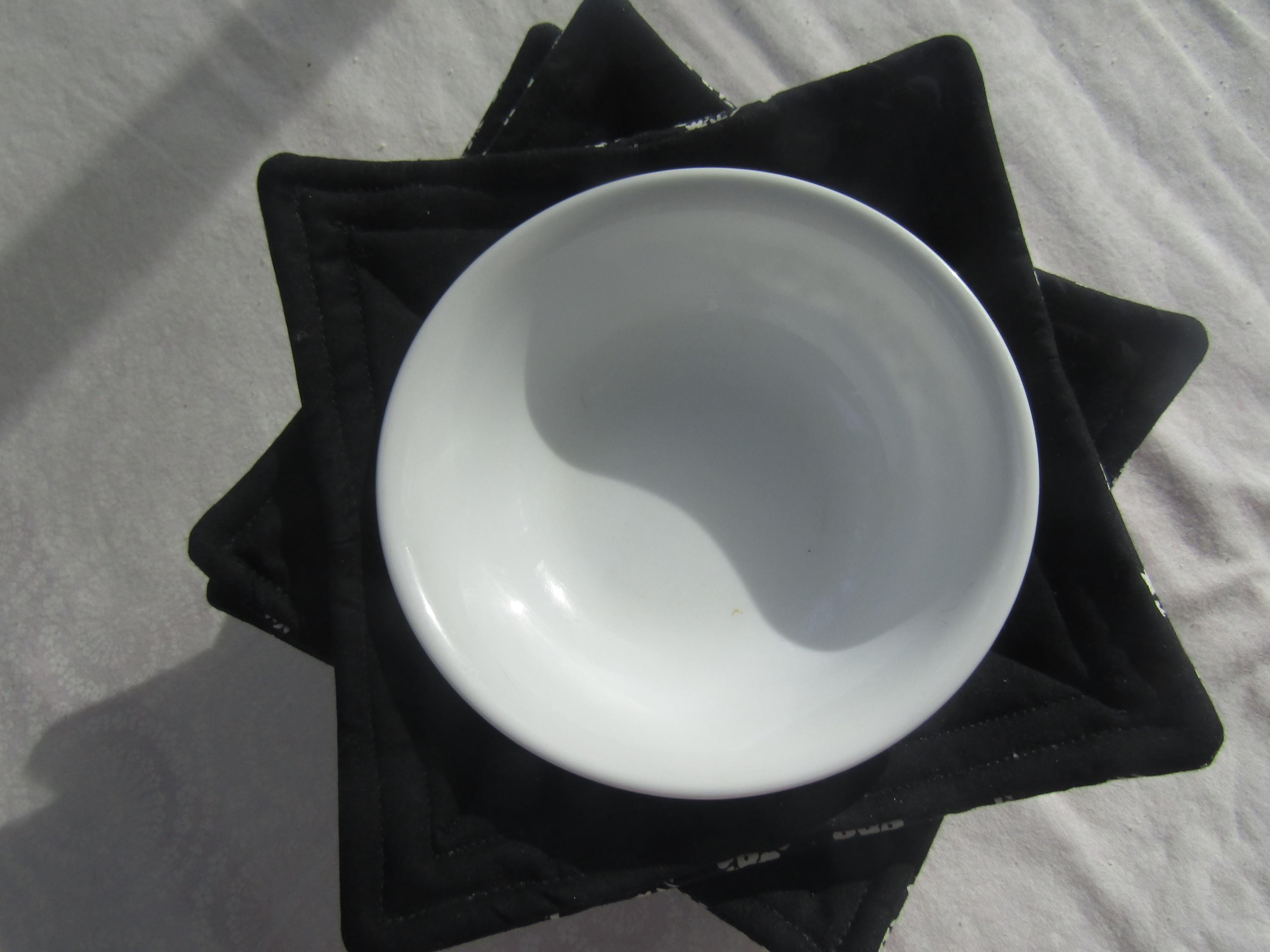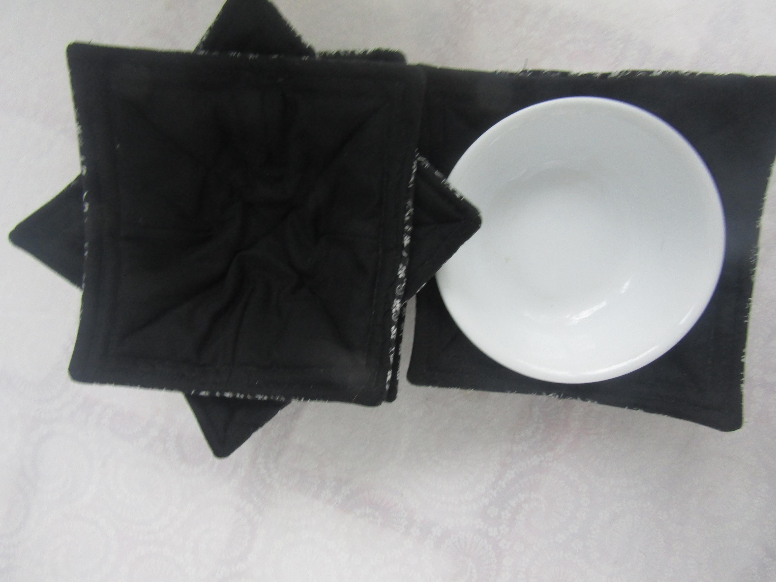Handmade, hot, soup bowl, cozy, potholder, you can even use it for, ice, cream or candy dish, black, with white, flowers, great for, seniors, place bowl of soup in, cozy, and put in microwave. Never burn your hands again. All 100% natural, cotton, this is what makes it microwaveable. (Never leave microwave unattended or leave food in more than four (4) min.) This makes a great, gift, for, Christmas, teacher, Mother's Day, wedding shower, housewarming, (DO NOT heat dry food in cozy, there must be moisture in the bowl.)