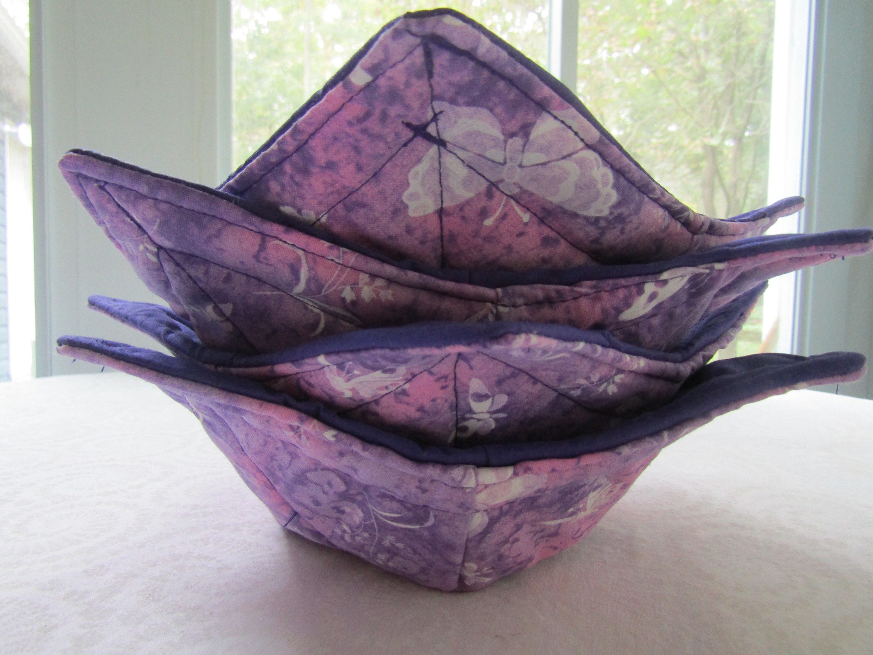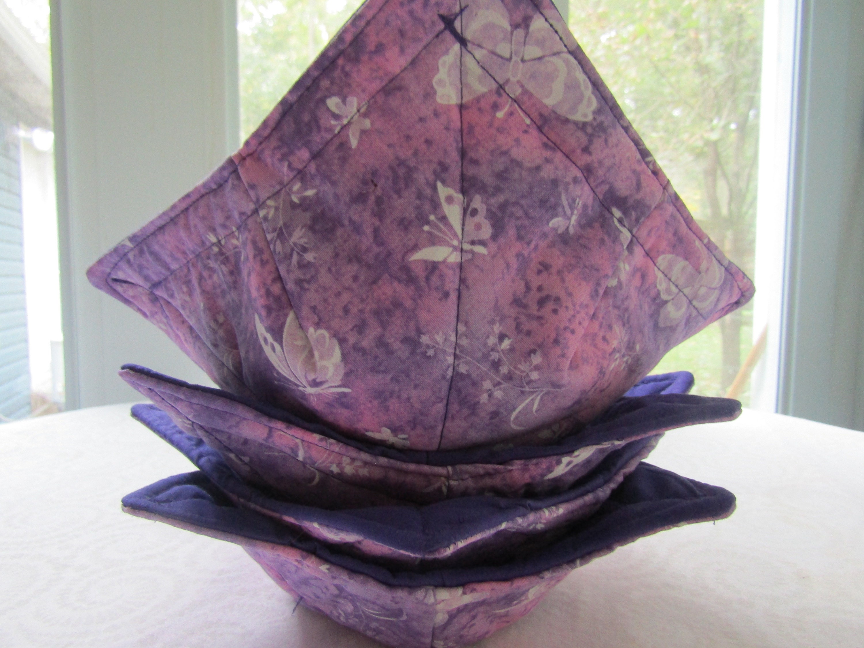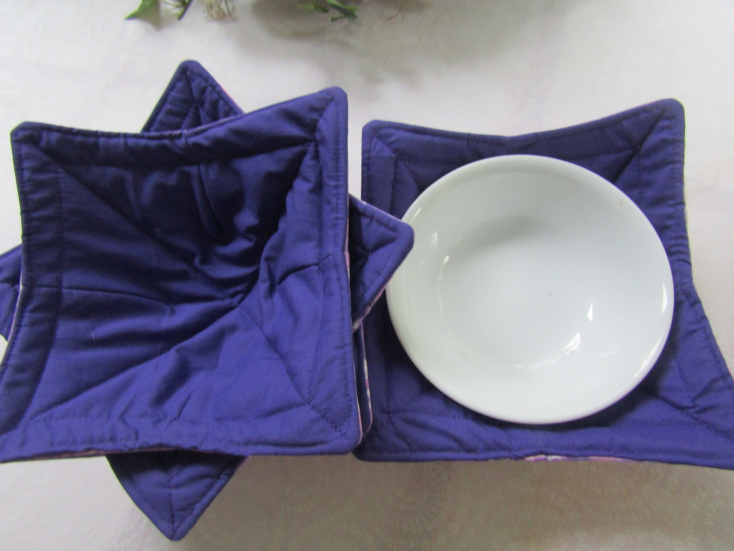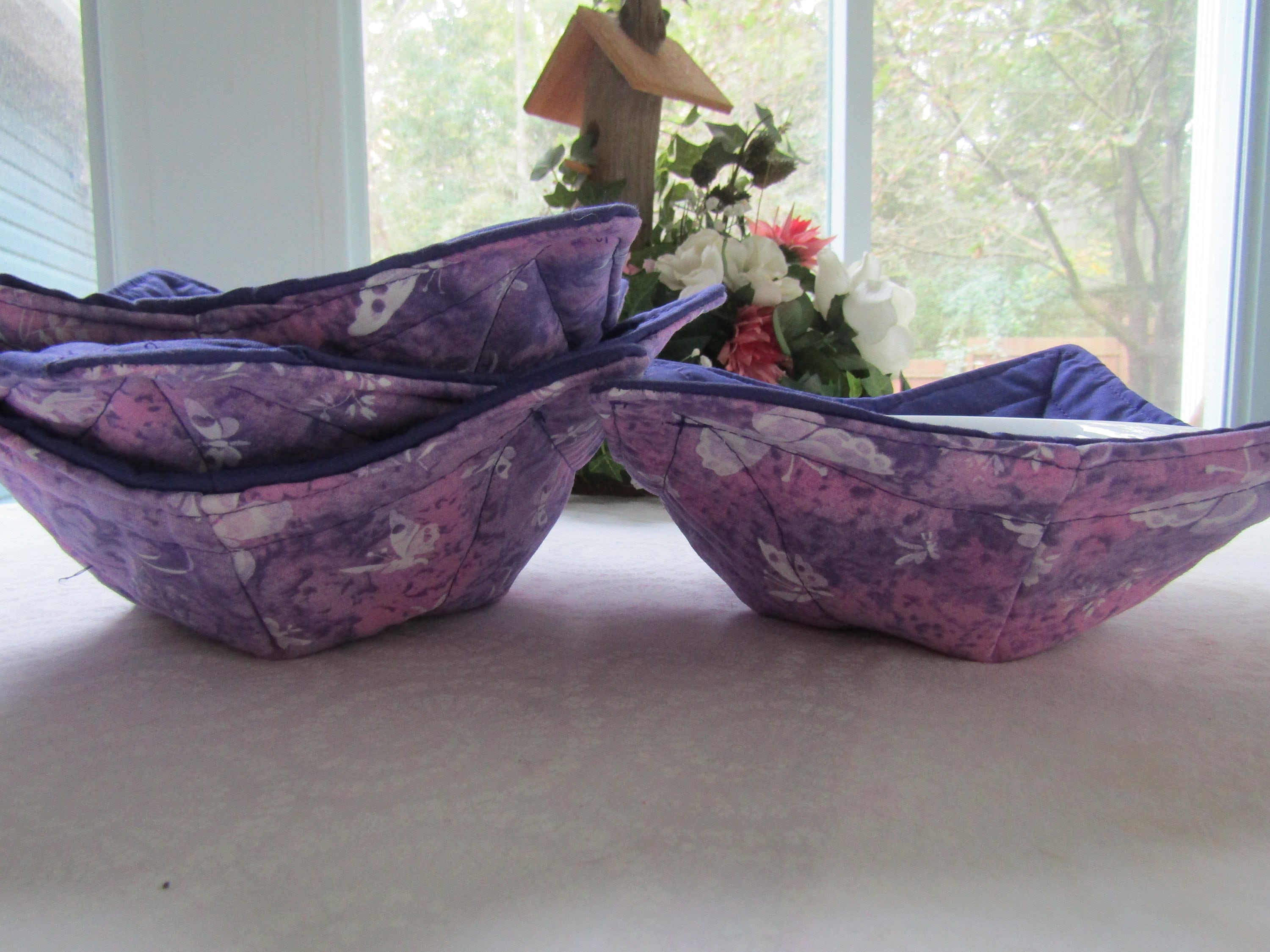 Hand sewn, hot soup bowl, cozies, or, ice cream, potholder, purple, lavender, white, pink, butterflies, all 100%, natural cotton, this is what makes it microwaveable, (never leave microwave unattended or leave food in more than, four, (4) min.) These cozies can protect your hands and furniture from. hot bowls, microwave to reheat only never heat dry food there must be moisture in the bowl. Makes a great, gift, for, teachers, wedding showers, Christmas, retirement, and housewarming, set of 4